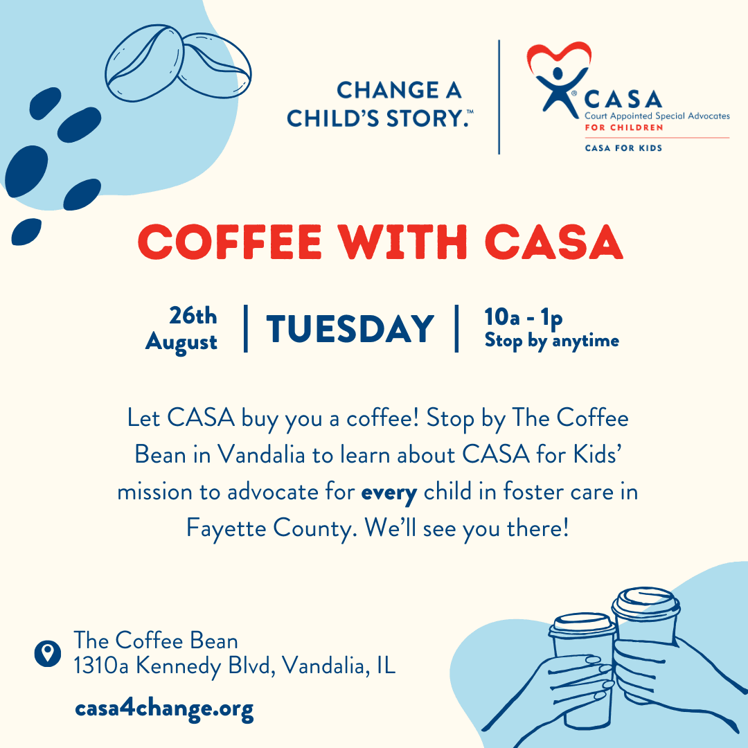 Let CASA for Kids buy you a cup of coffee! Stop by The Coffee Bean anytime between 10a - 1p on Tuesday 8/26 and learn about CASA for Kids' mission to advocate for every child in foster care in Fayette County. Being a CASA (Court-Appointed Special Advocate) is an incredibly rewarding and meaningful volunteer opportunity. We look forward to meeting you and hopefully serving the children of our community together!