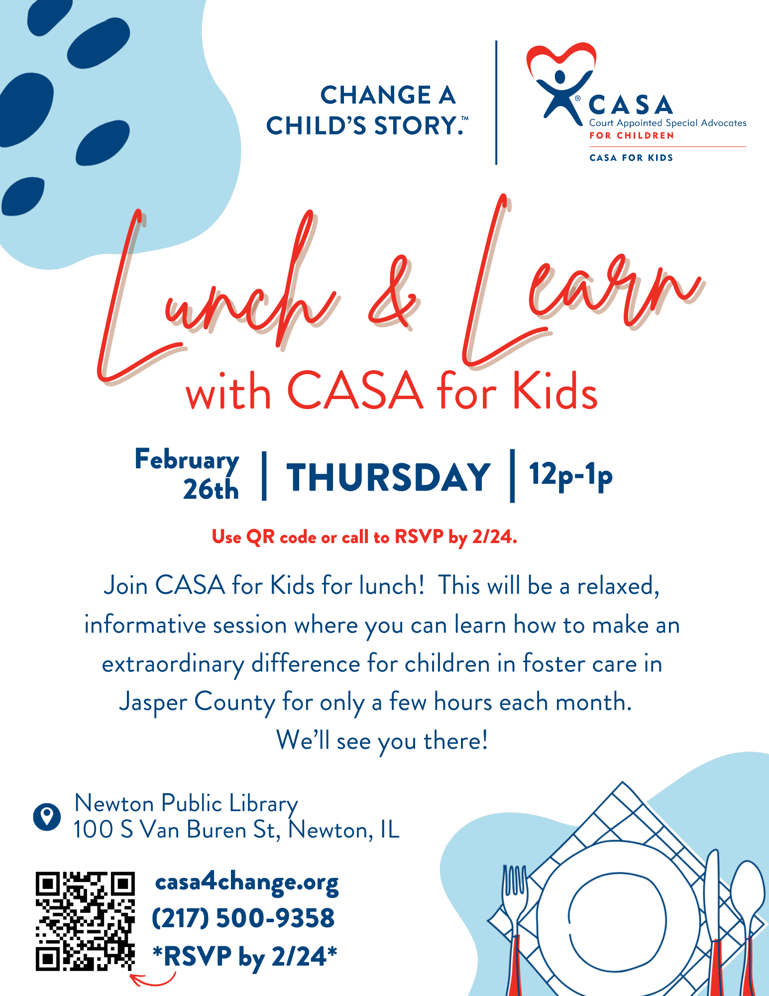 You’re invited to join CASA for Kids for a Lunch & Learn — a relaxed, informative session where you can enjoy a meal and learn how everyday people can make an extraordinary difference for children in foster care in Jasper County.